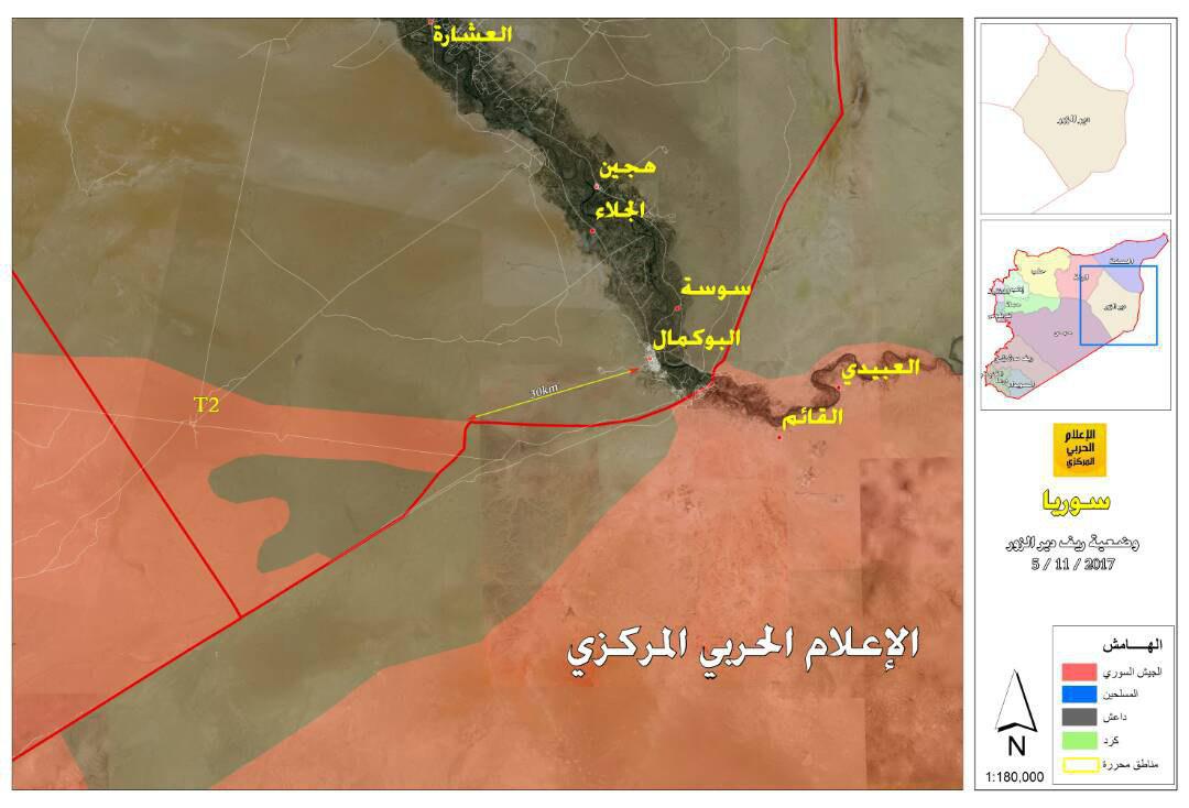 وتبعد وحدات الجيش السوري عن مدينة البوكمال مسافة 70 كم من محور الميادين .