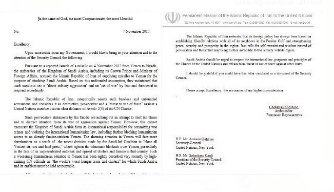 وقال ممثل إيران في الأمم المتحدة، غلام علي خوشرو، في الرسالة إن طهران تدين الاتهامات السعودية لها وتعتبر أنه لا أساس لها من الصحة.