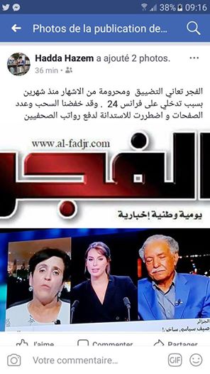 وأوضحت حدّة حزام في صفحتها على الفيسبوك أنّ السبب من وراء قرارها يعود إلى التضييق المالي المفروض على يوميتها والحرمان من الإشهار منذ ثلاثة أشهر بعد مداخلة لها على قناة فرانس 24.