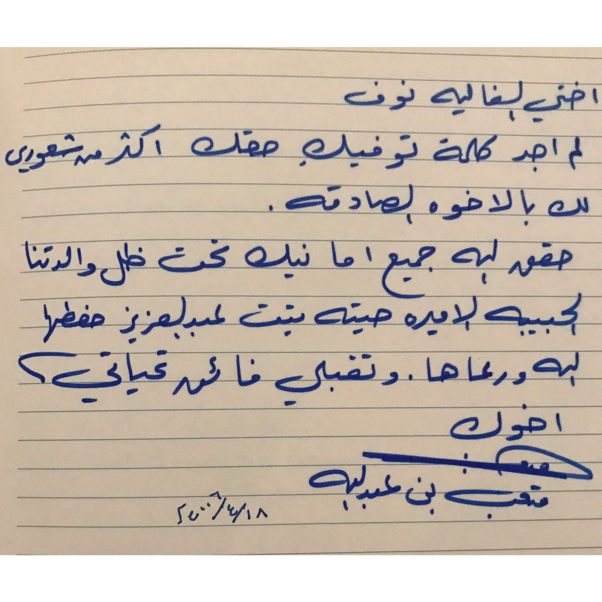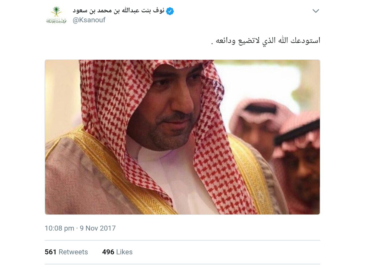 وقالت “بنت عبدالله” في تدوينات لهاعبر حسابها بموقع التدوين المصغر “تويتر” في أول تعليق لها على الامر مستذكرة ذكريات سابقة مع الامير “متعب”: “من قبل ١١ سنة أخذ القلم وخط كلماته على هذا الدفتر عند زيارته لوالدتي ( عمته) رحمها الله حفظك الله يالشهم الكريم . ويا أخي الغالي #متعب_بن_عبدالله”.