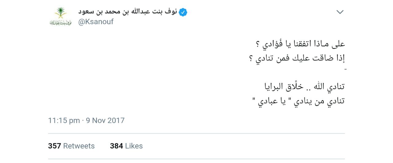 وأردفت “بنت عبدالله” معبرة عن مشاعرها تجاه الامر بأبيات شعرية قائلة: “على مـاذا اتفقنا يا فُؤادي ؟ إذا ضاقت عليك فمن تنادي ؟ تنادي الله .. خلَّاق البرايا تنادي من ينادي ” يا عبادي “.