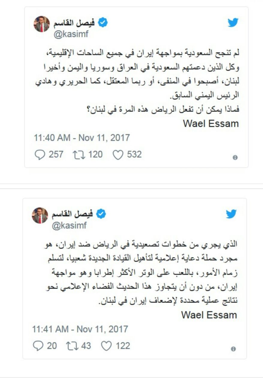 ونقل “القاسم” عبر سلسلة تغريدات له أحد التحليلات التي تقول: “لم تنجح السعودية بمواجهة إيران في جميع الساحات الإقليمية، وكل الذين دعمتهم السعودية في العراق وسوريا واليمن وأخيرا لبنان، أصبحوا في المنفى، أو ربما المعتقل، كما الحريري وهادي الرئيس اليمني السابق. فماذا يمكن أن تفعل الرياض هذه المرة في لبنان؟”