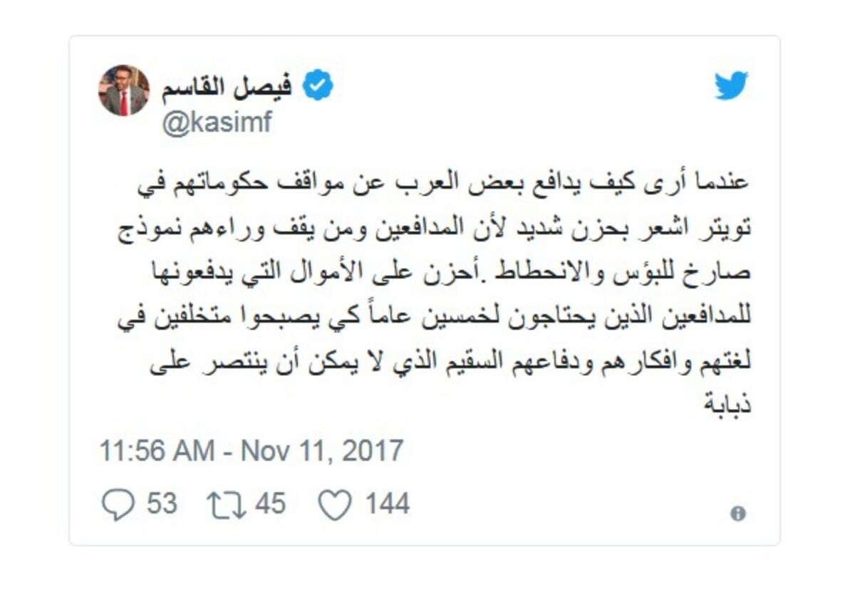 وأشار “عندما أرى كيف يدافع بعض العرب عن مواقف حكوماتهم في تويتر اشعر بحزن شديد لأن المدافعين ومن يقف وراءهم نموذج صارخ للبؤس والانحطاط .أحزن على الأموال التي يدفعونها للمدافعين الذين يحتاجون لخمسين عاماً كي يصبحوا متخلفين في لغتهم وافكارهم ودفاعهم السقيم الذي لا يمكن أن ينتصر على ذبابة”.