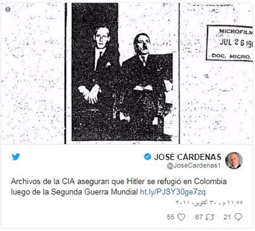 وأضافت المذكرة بحسب رواية سيتروين، أن هتلر غادر كولومبيا متجهاً لإلى الأرجنتين في يناير 1955.