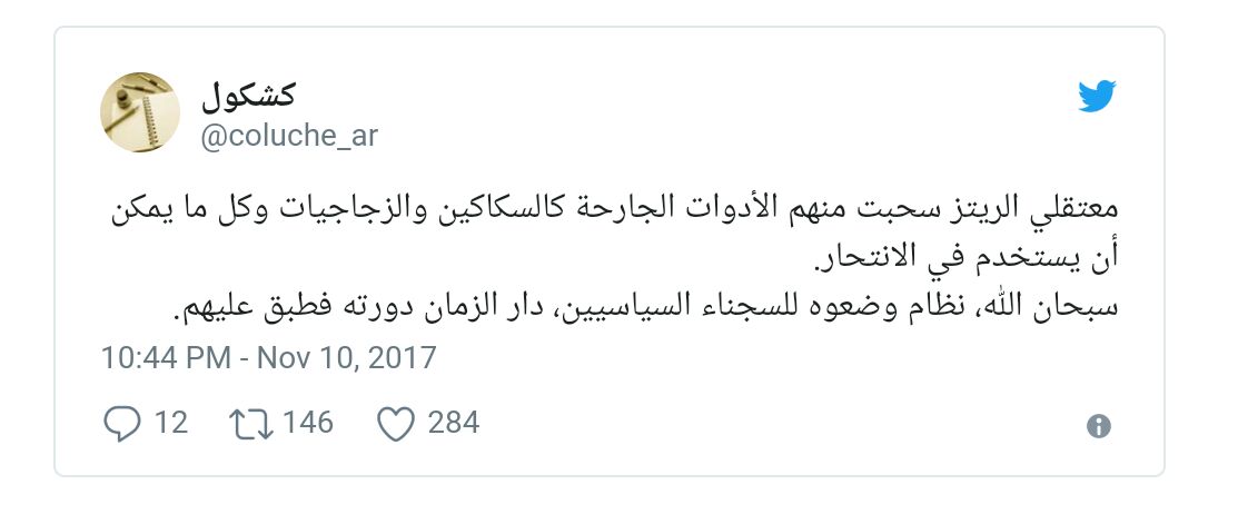 ودون “كشكول” في تغريدة له بالأمس ما نصه:”معتقلي الريتز سحبت منهم الأدوات الجارحة كالسكاكين والزجاجيات وكل ما يمكن أن يستخدم في الانتحار.”