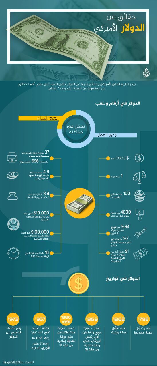 اقتصاد _ الكوثر: يزخر التاريخ المالي الأميركي بحقائق مثيرة عن الدولار . نلقي الضوء على بعض أهم الحقائق غيرالمشهورة عن العملة " رقم واحد" بالعالم.