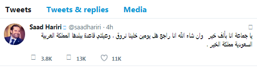 وتعتبر هذه هي أول تغريدة للحريري منذ أن التقى العاهل السعودي سلمان بن عبد العزيز في يوم الإثنين 6 نوفمبر/ تشرين الثاني، بعد يومين من إعلان استقالته من رئاسة الحكومة اللبنانية، من العاصمة السعودية الرياض.