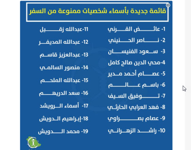 وقال الحساب الذي ينشر القائمة الثانية في غضون أسبوعين، إن هذه الأسماء تم تعميمها على جميع المنافذ الحدودية والمطارات في المملكة. وجاء على رأس القائمة، الشيخ عائض القرني، ومحيي الدين كامل، نجل رجل الأعمال المعتقل صالح كامل. إضافة إلى الباحث الشيعي توفيق السيف، والباحث في الأديان والمعتقدات، عصام أحمد مدير، ومقدم البرامج عبد الله المديفر. وضمت القائمة أيضا، الأكاديمي سعود الفنيسان، والكاتب عبد الله الملحم، والإعلامي عبد العزيز قاسم. وشملت القائمة عددا من الدعاة، منهم سعد الدريهم، وراشد الزهراني، وإبراهيم الدويش، وناصر الحنيني، وعبد الله زقيل، ومنصور السالمي. أدناه قائمة ثانية وجديدة تضم أسماء أشخاص منعتهم السلطات السعودية من السفر وعممت أسمائهم على المنافذ الحدودية والمطارات.