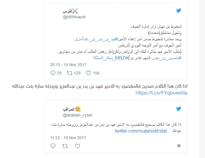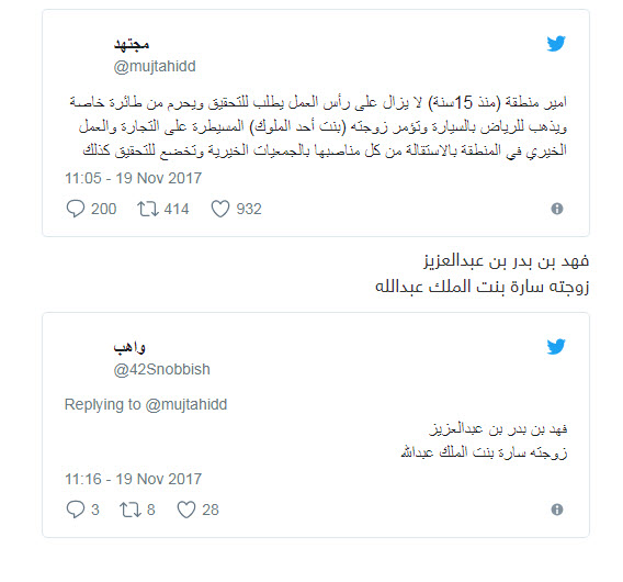وقال "مجتهد"، إن أمير منطقة لم يسمه، على رأس عمله منذ 15 سنة، طُلب للتحقيق، وحرم من طائرته الخاصة. وتابع: "ذهب للرياض بالسيارة، وأمرت زوجته (بنت أحد الملوك) المسيطرة على التجارة والعمل الخيري في المنطقة، بالاستقالة من كل مناصبها في الجمعيات الخيرية". وأوضح أن زوجته تخضع للتحقيق كذلك. وقال ناشطون إن الأمير المعني هو فهد بن بدر بن عبد العزيز، الذي عين أميرا لمنطقة الجوف شمال المملكة في العام 2002. وزوجة فهد بن بدر، هي سارة بنت الملك عبد الله بن عبد العزيز، وهي الأخت غير الشقيقة للأميرين متعب بن عبد الله، وتركي بن عبد الله، المعتقلين على خلفية قضايا متعلقة بالفساد. وكانت سارة بنت عبد الله، أعلنت استقالتها قبل أسبوع، من رئاسة جمعية الملك عبدالعزيز الخيرية النسائية التي تولت رئاستها قبل 16 عاما. واستقالت كذلك نائبتها بسمة المدني. يشار إلى أن الأمير فهد بن بدر، هو نجل بدر بن عبد العزيز، أحد أبناء الملك عبد العزيز الذين شكّلوا ما يعرف بـ"الأمراء الأحرار"، احتجاجا على طريقة الحكم في السعودية، وطالبوا حينها بحكم دستوري ومزيد من الصلاحيات، وغادروا إلى لبنان ومصر، لسنوات طويلة قبل أن يعودوا إلى المملكة. المصدر: عربي21 25 - 101