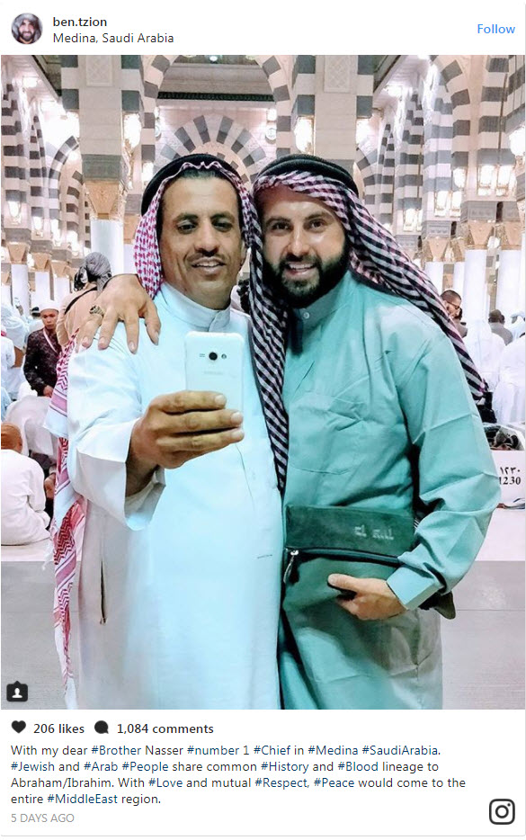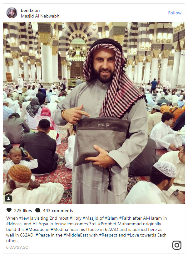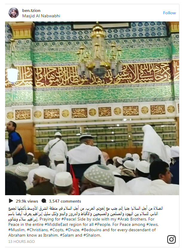 وكتب "بن تزيون"، المدون المشهور في فلسطين المحتلة العامل في صحيفة "Times of Israel"، في تدوينة تحت إحدى الصور: "عندما يزور يهودي ثاني أقدس مسجد للديانة الإسلامية بعد الحرم في مكة".