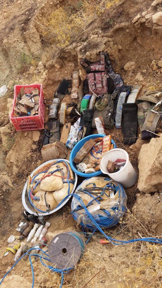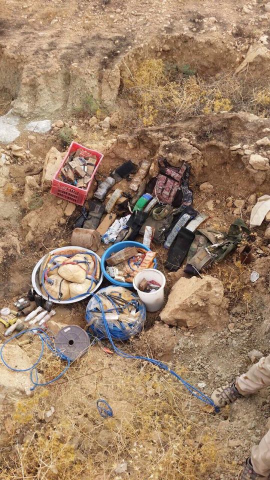 وقالت المديرية في بيان، اليوم (22 تشرين الثاني 2017)، إن "استخبارات الفرقة 15 وضمن منهاجها بملاحقة وتعقب كافة مصادر تسليح عصابات تنظيم داعش وبجهد استخباري فاعل ومعلومات دقيقة تمكنت من ضبط مخزن للدواعش في منطقة العياضية بقضاء تلعفر في الموصل"، مشيرة إلى أن المخزن "يضم 20 حزام ناسف، 8 أكياس من مادة الـ c4 ،10 قذائف لطائرات مسيرة، 12 رمانة يدوية، 60 مسطرة تفجير، 2 بكرة تفجير".