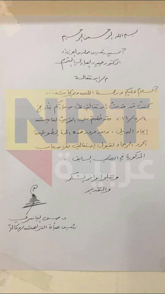 ولم يشكك إعلام النزاهة في كتاب الاستقالة الذي نشرته NRT عربية، لكنه قال في بيان إن خبر الاستقالة غير صحيح.