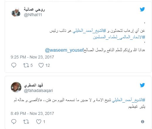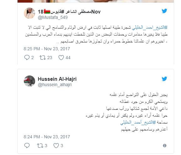 ورغم ما عرف عن العمانيين بتسامحهم ونبذهم للتطرف والعنف والارهاب ودفاعا عن شيخهم الجليل واستنكارا لما تقوم به الدول الأربعة، أطلق مغردون عمانيون على موقع “تويتر” هاشتاجا بعنوان: ” #الشيخ_احمد_الخليلي” احتل “الترند” العماني، أكدوا فيه بأن التطاول على مقام الشيخ أحمد الخليلي خط احمر، مشيرين إلى انه لو كان الشيخ للإرهاب قدوة فيفخرون بكونهم إرهابيين.
