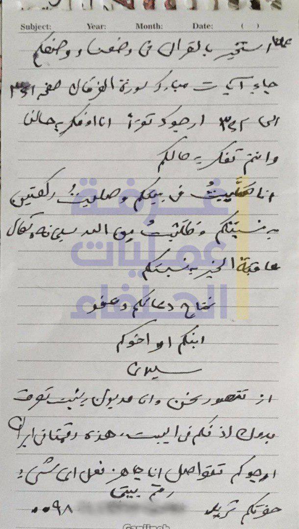 حيث اعتذر من صاحب المنزل لاضطراره المكوث في المنزل بدون اذنه وطلب منه مسامحته، وابدى الحاج قاسم في الرسالة استعداده لدفع ثمن أي ضرر لحق في المنزل ووضع رقمه الخاص في نهاية الرسالة وأكد أنه جاهز لفعل أي شيء يطلبه صاحب المنزل كما أشار الحاج خلال رسالته إلى عدم وجود أي خلاف بينه كشيعي وبين صاحب المنزل كونه من أهل السنة لأن الإثنين من أتباع النبي الأعظم ومحبي أهل البيت عليهم السلام.