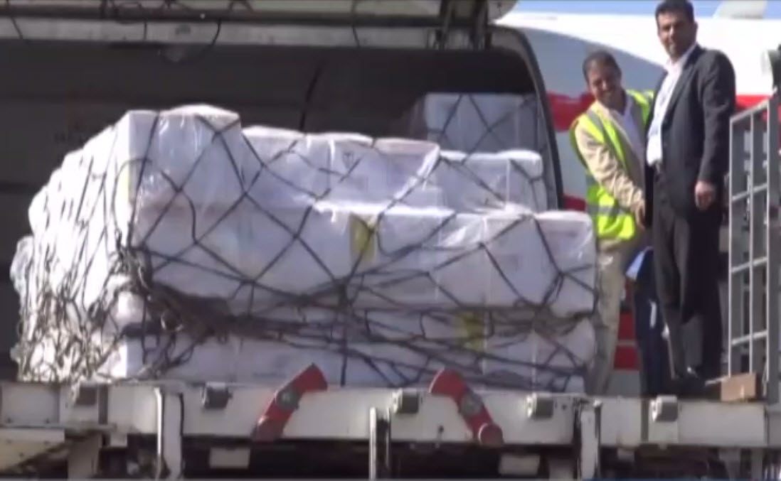 وتحمل هذه الطائرات خمسة عشر طناً من لقاحات شلل الاطفال وموظفي اغاثة دوليين.
