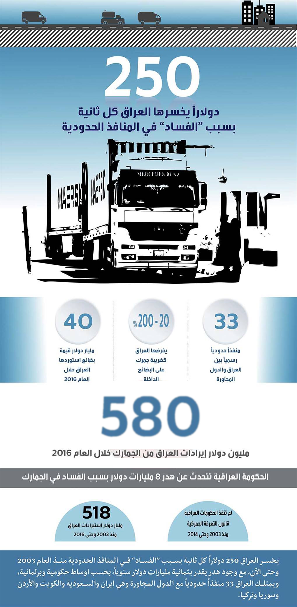 يخسر العراق 250 دولاراً كل ثانية بسبب “الفساد” في المنافذ الحدودية منذ العام 2003 وحتى الآن، مع وجود هدر يقدر بثمانية مليارات دولار سنوياً، بحسب اوساط حكومية وبرلمانية، ويمتلك العراق 33 منفذاً حدودياً مع الدول المجاورة وهي ايران والسعودية والكويت والأردن وسوريا وتركيا