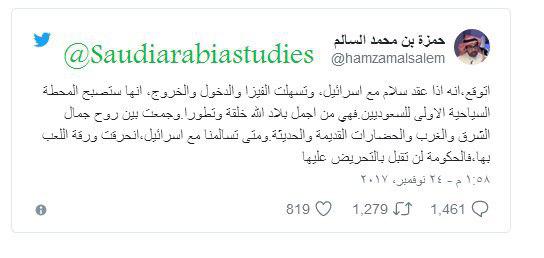 وكتب “السالم” تغريدةً أثارت جدلاً وردود أفعالٍ واسعة عليها، حيث قال: “اتوقع، انه اذا عقد سلام مع "اسرائيل"، وتسهلت الفيزا والدخول والخروج، انها ستصبح المحطة السياحية الاولى للسعوديين”.