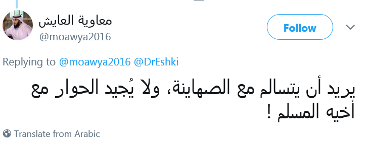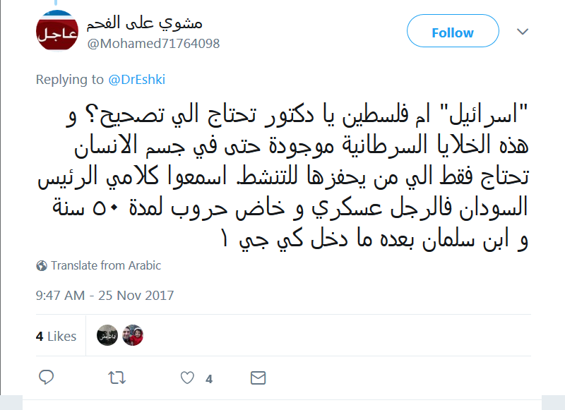 وبحسب "عربي 21"، فقد كتب عشقي في تغريدته على حسابه الرسمي في "تويتر"، أن "إسرائيل جرح نازف نسعى لإيقافه"، فيما وصف إيران بانها "سرطان" و"لابد من استئصاله"، على حد زعمه.