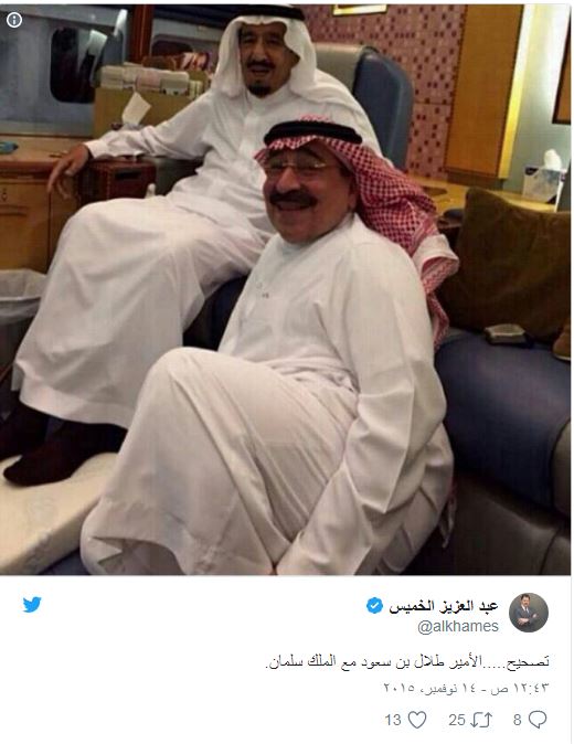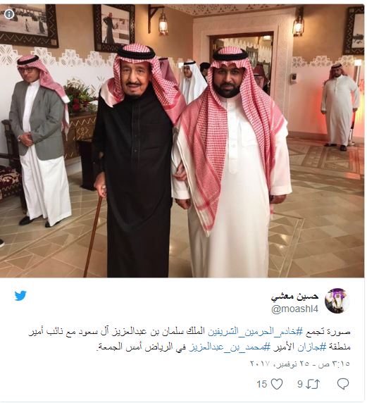 ويظهر في الصورتين الملك سلمان مع الأميرين طلال بن سعود ومحمد بن عبدالعزيز نائب أمير منطقة جازان، وأعرب متداولو الصورتين عن أمانيهم في أن يحفظ الله "العاهل السعودي ويوفقه لما يحب ويرضى، ويسدد خطاه".