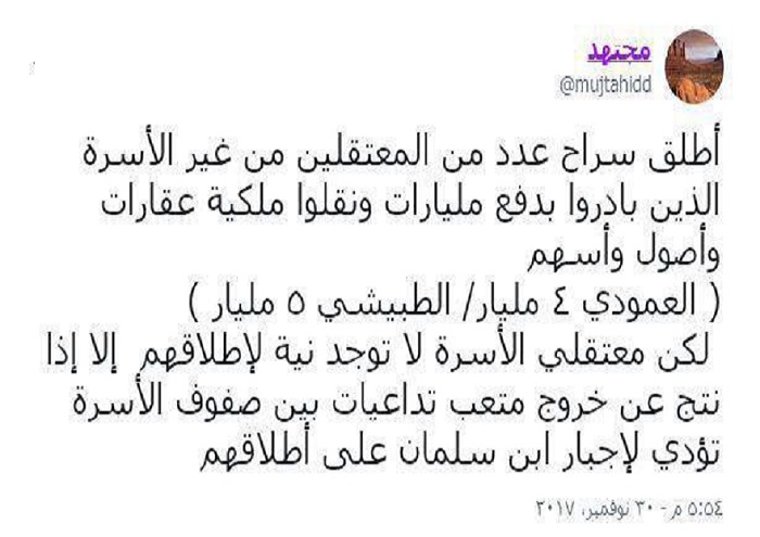 لكن معتقلي الأسرة لا توجد نية لإطلاقهم إلا إذا نتج عن خروج متعب تداعيات بين صفوف الأسرة تؤدي لإجبار ابن سلمان على أطلاقهم".