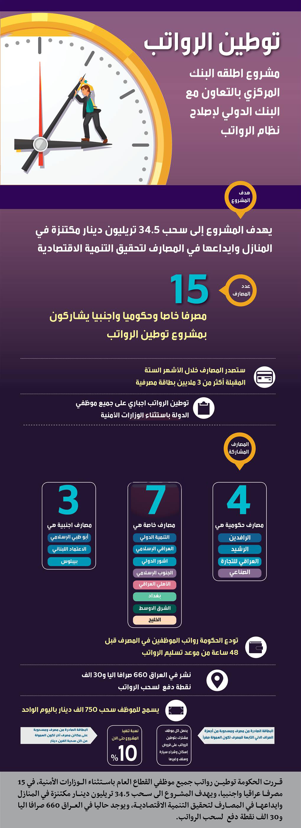 قررت الحكومة العراقية توطين رواتب جميع موظفي القطاع العام باستثناء الوزارات الأمنية، في 15 مصرفا عراقيا واجنبيا، ويهدف المشروع الى سحب 34.5 تريليون دينار مكتنزة في المنازل وايداعها في المصارف لتحقيق التنمية الاقتصادية، ويوجد حاليا في العراق 660 صرافا اليا و30 الف نقطة دفع لسحب الرواتب.