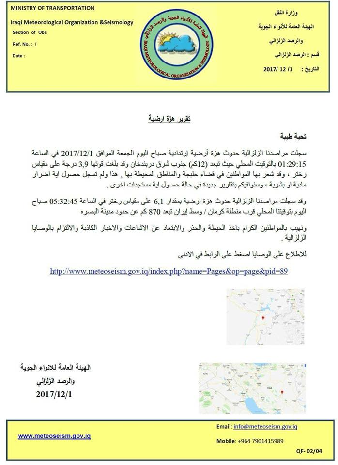 ولفتت الى "تسجيلها حدوث هزة ارضية بمقدار 6.1 على مقياس رختر في الساعة {05:32:45} صباح اليوم بتوقيت العراق المحلي قرب منطقة كرمان جنوب شرق ايران التي تبعد 870 كم عن حدود محافظة البصرة".