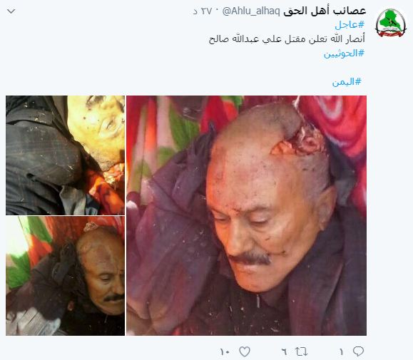 ونشر حساب العصائب في "تويتر"، تأكيد خبر مقتل الرئيس اليمني المخلوع علي عبدالله صالح اليوم أثناء توجهه إلى مسقط رأسه جنوب العاصمة صنعاء.