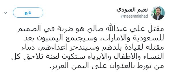 وقال المتحدث الرسمي باسم العصائب، نعيم العبودي، عبر حسابه على موقع "تويتر"، اليوم (4 كانون الأول 2017)، إن "مقتل علي عبدالله صالح هو ضربة في الصميم للسعودية والإمارات، وسيجتمع اليمنيون بعد مقتله لقيادة بلدهم وسيندحر أعداءهم، دماء النساء والأطفال والأبرياء ستكون لعنة تلاحق كل من تورط بالعدوان على اليمن العزيز".