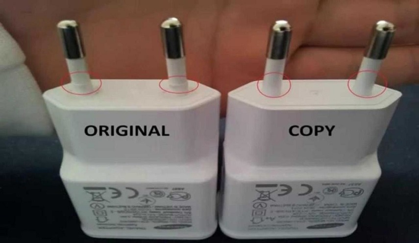 أول علامات الاختلاف هي الشعار، في شواحن شركة سامسونغ مثلا ستلاحظ سمك حرف A ليس كباقي الأحرف في الشاحن المقلد، أما الأصلي فكلمة سامسونغ هي بنفس سمك الخط .