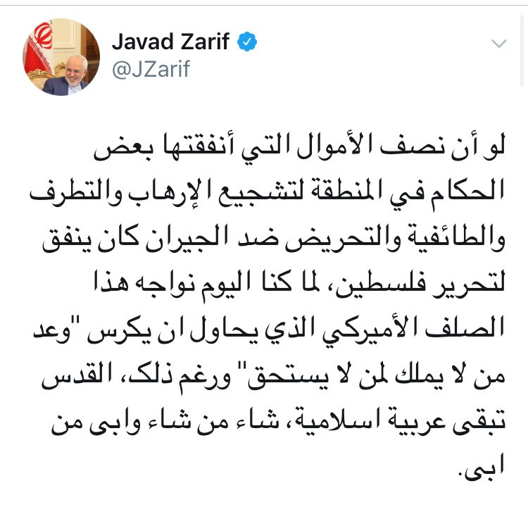 وکتب وزیر الخارجیة الایرانی تغریدة على موقع تویتر بهذا الخصوص قال فیها " لو کانت نصف الاموال التی انفقها بعض حکام المنطقة لدعم الارهاب والتطرف والطائفیة والتحریض ضد دول الجوار، تنفق من اجل تحریر فلسطین، لما کنا نواجه الیوم الانانیة الامریکیة التی ترید اعلان بیان" وهب ما لایملک لمن لایستحق"، بالرغم من کل ذلک فان القدس ستبقى الى الأبد عربیة – اسلامیة سواء شاؤوا أم أبوا ذلک.