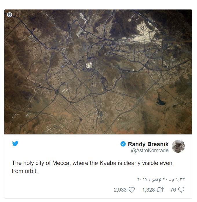 وغرد بريسنيك على الصورة: "مدينة مكة المقدسة، حيث تتواجد الكعبة المشرفة، والتي تظهر بشكل واضح حتى من الفضاء الخارجي".