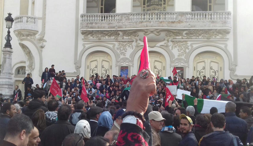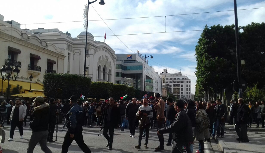 ولبى مئات التونسيين النداء، حيث رفع المتظاهرون الأعلام الفلسطينية، ورددوا هتافات منددة بالولايات المتحدة و"إسرائيل" وداعمة لفلسطين.