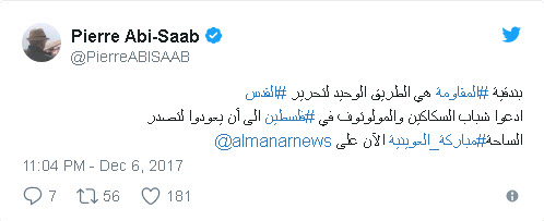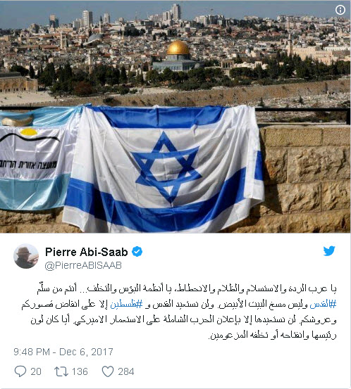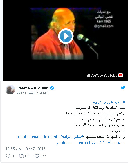 وتطرق “أبي صعب” لنشر أبيات من القصيدة الشهيرة للشاعر العراقي مظفر النواب “القدس عروس عروبتكم” قائلا: “القدس عروس عروبتكم فلماذا أدخلتم كل زناة الليل إلى حجرتها ووقفتم تستمعون وراء الباب لصرخات بكارتها وسحبتم كل خناجركم وتنافختم شرفا وصرختم فيها أن تسكت صونا للعرض فما أشرفكم أولاد القحبة هل تسكت مغتصبة ؟ مظفر النواب”.