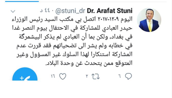 وقال رئيس كتلة الحزب الديمقراطي الكردستاني، في البرلمان، عرفات كرم، في تغريدة له على موقع "تويتر" اليوم ( 9 كانون الأول 2017)، إن "مكتب رئيس الوزراء، حيدر العبادي، دعاه للمشاركة في احتفالات النصر في بغداد، لكنه بما ان العبادي لم يذكر اسم البيشمركة في خطابه ولم يشر إلى تضحياتهم، فلن يشارك في الاحتفالات، استنكارا لهذا السلوك غير المسؤول وغير المتوقع لمن يتحدث عن وحدة البلاد"، حسب تعبيره.
