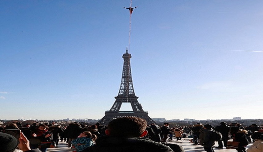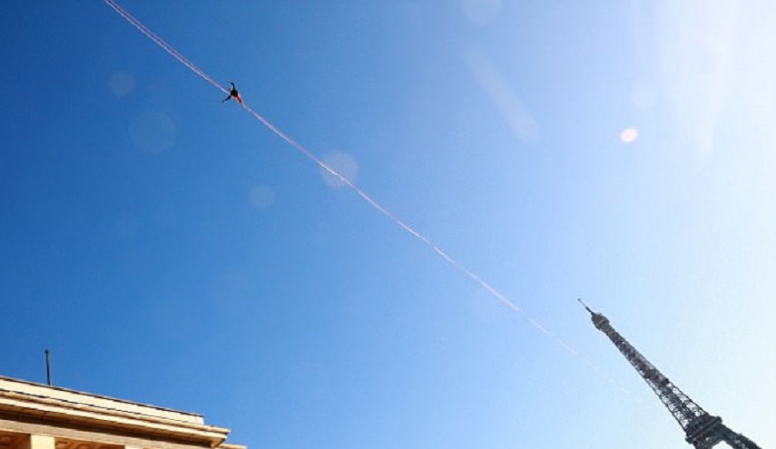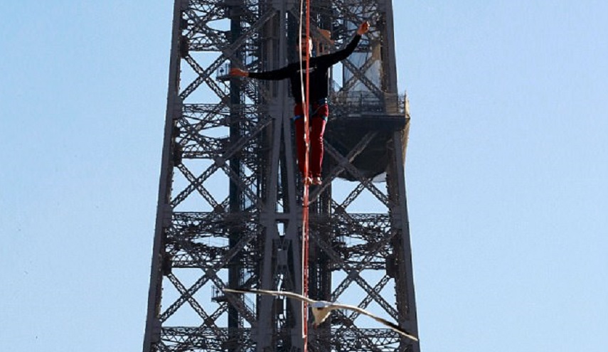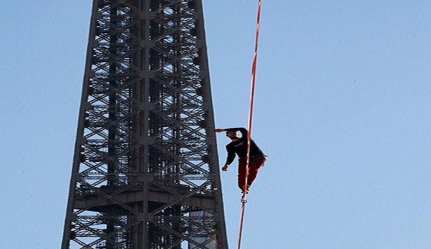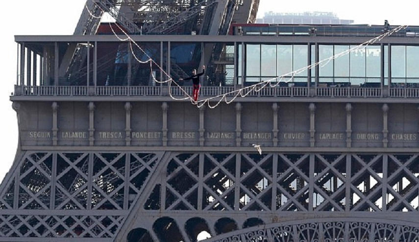 بالفيديو .. متهور يسير أعلى حبل معلق ببرج إيفل وسط الحشود
