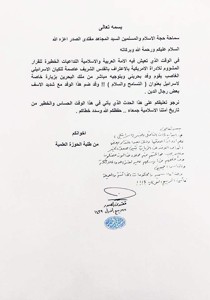 وتداولت مواقع التواصل الاجتماعي وثيقة تحوي سؤالا لأحد طلبة الحوزة وجوابا على السؤال من قبل السيد مقتدى الصدر جاء فيها:
