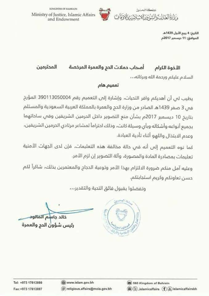 ووفقا لمنشور تداوله ناشطون عبر مواقع التواصل الاجتماعي “فيسبوك وتويتر” ورصدته “وطن”، فقد أصدر رئيس شؤون الحج والعمرة بوزارة العدل والشؤون الإسلامية والأوقاف البحرينية خالد المالود تعميماً ينبه فيه أصحاب حملات الحج والعمرة المرخصة من التصوير داخل الحرمين الشريفين وفي ساحاتهما.