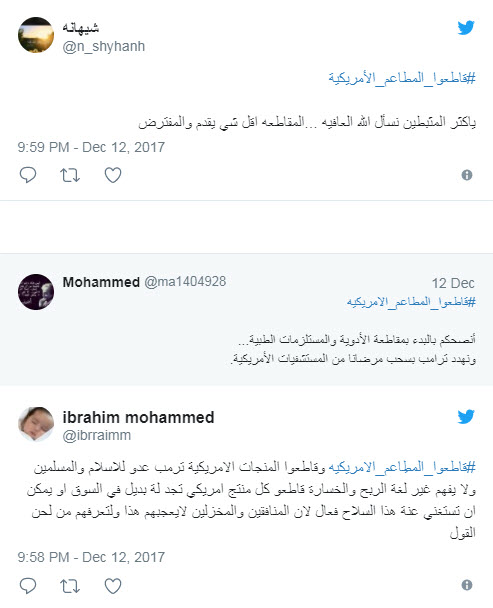 وتحت هاشتاغ “#قاطعوا_المطاعم_الامريكيه”، دونت آلاف التغريدات المؤيدة للفكرة التي رأوها أحد الردود الممكنة والمؤثرة بشأن القرار الأمريكي حول القدس.