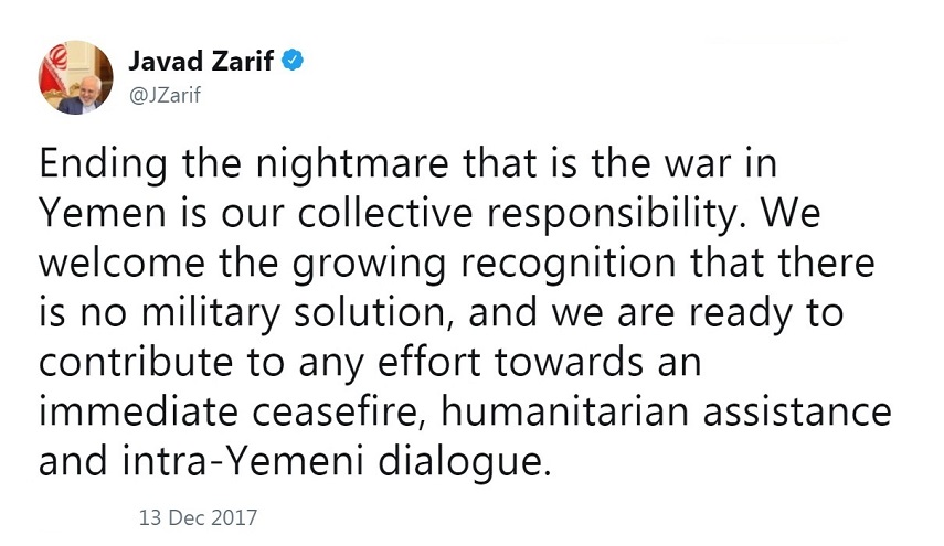 وفي تغريدة له على صفحته في توتير قال ظريف لقد رحبنا بالرؤية التي تؤكد على عدم وجود حل عسكري في هذا المجال.
