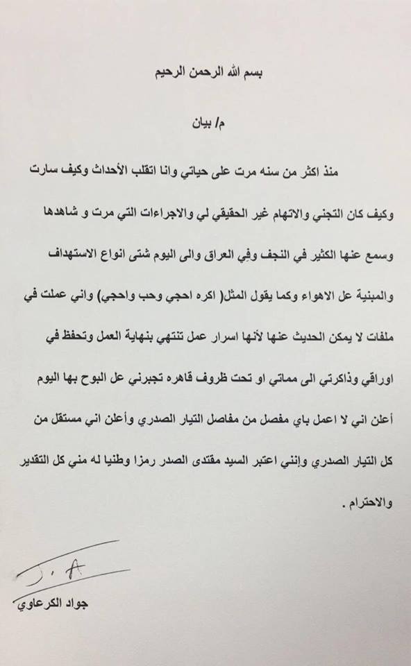 وبحسب وثيقة فان الكرعاوي، أعلن انه "نتيجة للتجني عليه والاتهامات غير الحقيقية بحقه، وغيرها من الإجراءات فقد قرر الانسحاب من كافة مفاصل التيار الصدري".