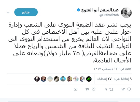 وكتب "أبوالفتوح" عبر حسابه على موقع التغريدات القصيرة طتويترط : " يجب نشر عقد الضبعة النووى على الشعب وإدارة حوار علنى عليه بين أهل الاختصاص فى كل النواحي لان العالم يخرج من استخدام النووى الى التوليد النظيف للطاقة من الشمس والرياح فضلا على ضخامة القرض( 25 مليار دولار)وتبعاته على الأجيال القادمة".