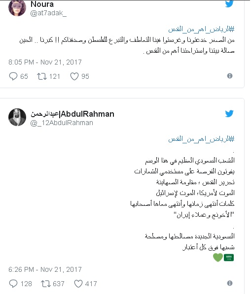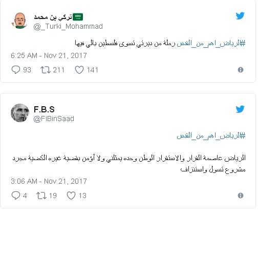 وهاجم سعوديون كثيرون، بينهم كُتّاب وشعراء ومشاهير، القضية الفلسطينية، عبر آلاف التغريدات التي احتفت بوسم "#الرياض_أهم_من_القدس".