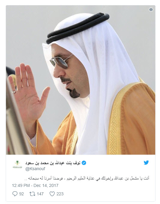وقالت “في تدوينة لها عبر حسابها بموقع “تويتر” مرفقة بها صورة للأمير: “أنت يا مشعل بن عبدالله وإخوتك في عناية العليم الرحيم ، فوضنا أمرنا له سبحانه “.
