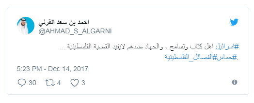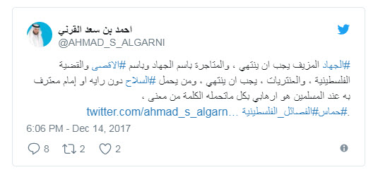 وقال “القرني” في تدوينات له عبر حسابه بموقع التدوين المصغر “تويتر” :”#اسرائيل اهل كتاب وتسامح ، والجهاد ضدهم لا يفيد القضية الفلسطينية …