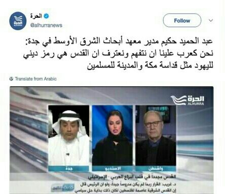 وقال عبد الحميد حكيم مدير معهد أبحاث الشرق الأوسط في جدة (غرب السعودية) خلال تصريحات لقناة الحرة الأميركية التي تبث باللغة العربية إن على العرب التفهم والاعتراف بأن القدس رمز ديني لليهود مثل ما أن مكة المكرمة والمدينة المنورة رمزان دينيان مقدسان لدى المسلمين حسب زعمه.
