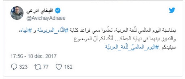 واختار أدرعي أن يلقي دروسا في التاء المربوطة والهاء المربوطة، بمناسبة اليوم العالمي للغة العربية، لكنه نطق خطأ وكتب خطأ.