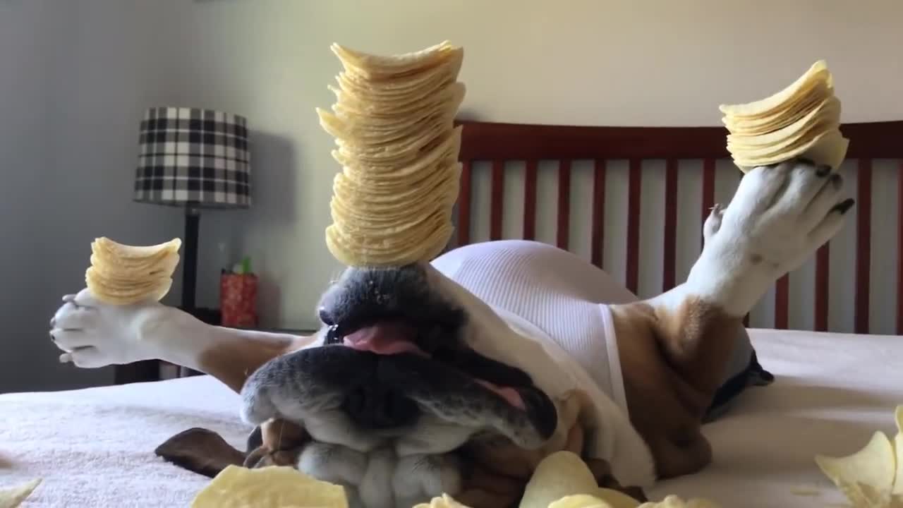 ونجح الكلب الموهوب، كما يعرض الفيديو، في أن يحافظ على ثباته تماما، أثناء حمله لرقاقات البطاطا، التي وضعها صاحبه على رقبته وكلتي يديه.