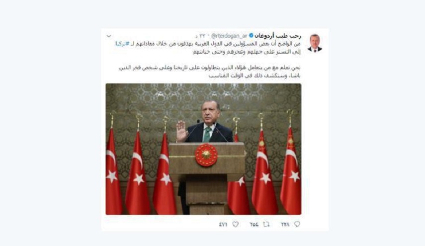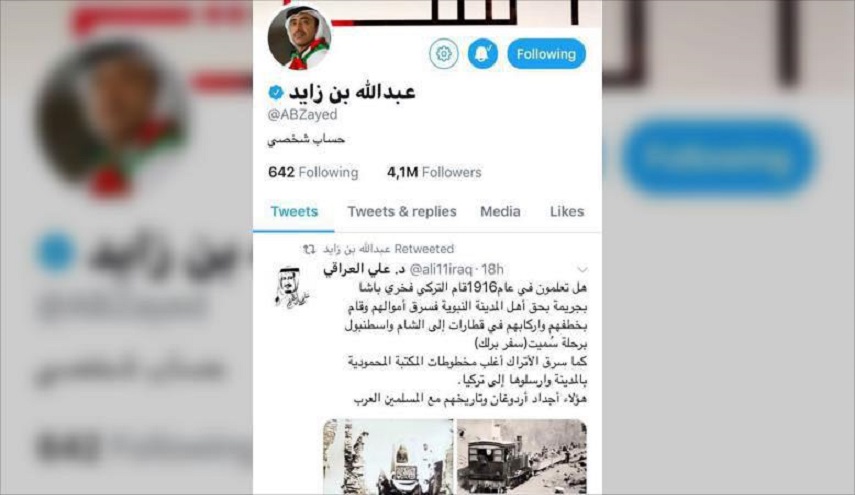 وارتفعت حدة الأزمة بين تركيا والإمارات على خلفية إعادة وزير الخارجية الإماراتي عبد الله بن زايد نشر تغريدة اعتبرت مسيئة للأتراك والرئيس رجب طيب أردوغان وتتهم أجدادهم بقتل أهل المدينة المنورة وسرقة أموالهم ووثائقهم.