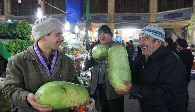 و يرجع تقليد تناول البطيخ الأحمر في هذه الليلة إلى تقليد إيراني قديم يذهب إلى أن اللون الأحمر يزيل الأمراض من الجسم ويمنحه الصحة والعافية ويبعد عن متناوله المرض طيلة فصل الشتاء .