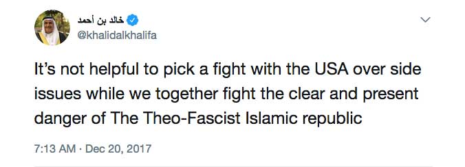 وكتب الوزير البحريني عبر حسابه بموقع التواصل الاجتماعي "تويتر" قائلا: إنه "ليس من المفيد افتعال معركة مع الولايات المتحدة حول قضايا جانبية، ونحن نواجه معا الخطر الواضح والقائم" لإيران حسب زعمه.